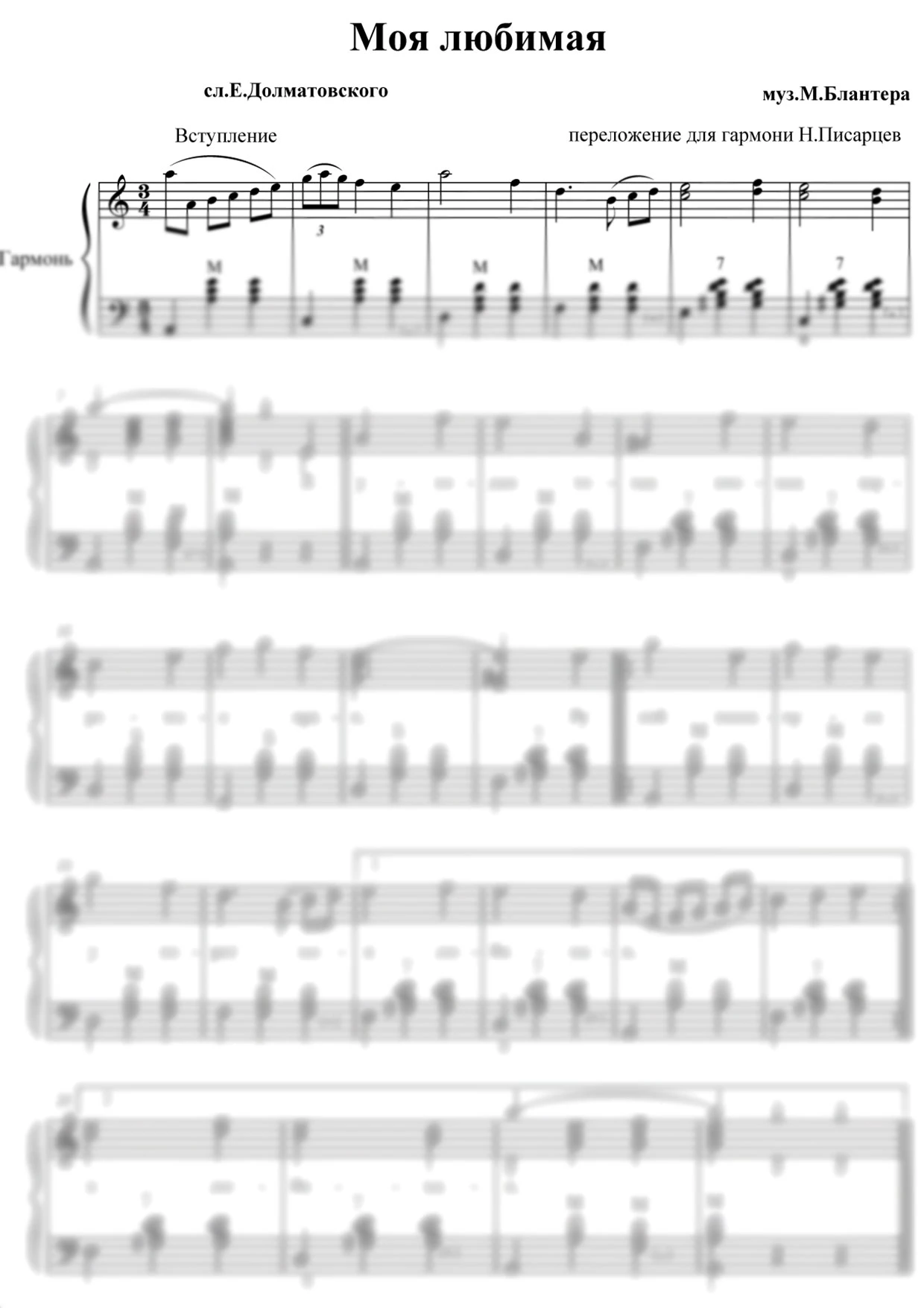 Осенью 1939 года композитор Матвей Блантер, поэты Владимир Луговской и Евгений Долматовский участвовали в походе Красной Армии в Западную Белоруссию. Они написали несколько песен, в том числе «Моя любимая». Первый вариант стихов был неудачным, и Блантер попросил поэтов написать другой текст. Вскоре Луговской потерял интерес к песням, и новые слова написал Долматовский. Долматовский вспоминал: «Мне кажется, что „Моя любимая“ после 22 июня была бы мрачнее. В ней есть что-то от лёгких дней. Возможно, её запели, потому что она мирная и элегически ворошит воспоминания». Блантер говорил: «Нельзя представлять, что военные песни начались 22 июня 1941 года и закончились 9 мая 1945 года. Война принесла горе, потери, лишения, но люди оставались людьми, шутили, смеялись, любили. Лучшие предвоенные годы воспринимались по-новому. Многие считают, что песни эти появились в военное время. Я горжусь, что „Моя любимая“, написанная в дни мира, стоит в этом строю». Песня «Моя любимая» была близка фронтовикам, воспринималась как письмо к родным. Интересно, что строка «Любимая моя» стала рефреном. Композитор и поэт спели «Моя любимая» и поняли, что так лучше. Мелодия потребовала другого ударения в слове «любимая», что придало рефрену особое обаяние. Мелодия на гармони: Слова песни: Я уходил тогда в поход В суровые края, Рукой взмахнула у ворот Моя любимая. Рукой взмахнула у ворот Моя любимая. Второй стрелковый храбрый взвод Чтоб все мечты мои сбылись В кармане маленьком моём | |